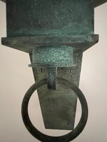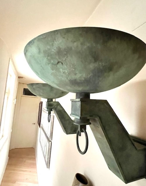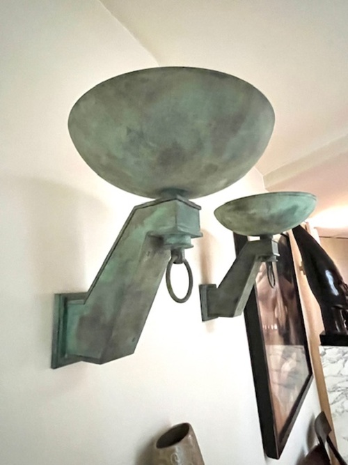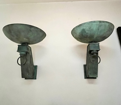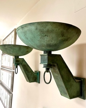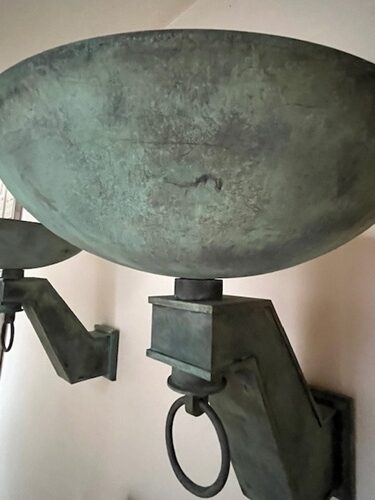 Pareja de apliques estilo ART DECO de pared realizados en bronce con pátina verde original. Presentan brazos angulares de diseño geométrico con copas superiores en forma de cuenco y aros decorativos colgantes. Piezas de gran carácter, ideales para iluminación ambiental y decoración de interiores clásicos o eclécticos. Se conservan en muy buen estado, con pátina original y signos de uso acordes a su antigüedad.