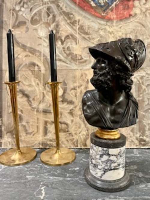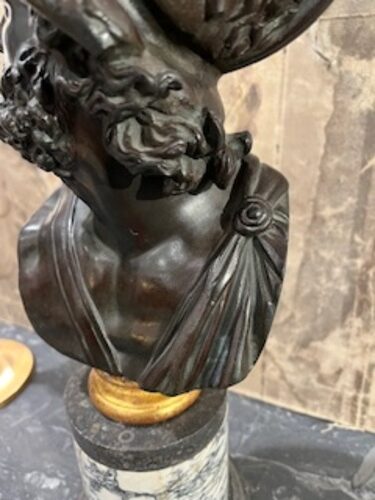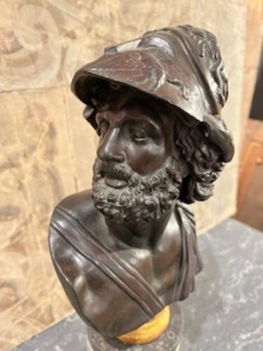 Un bronce patinado del siglo XIX que representa al héroe Áyax o Menelao, rey de Esparta, montado sobre una base en forma de columna de mármol gris veteado, un recuerdo clásico del Grand Tour.