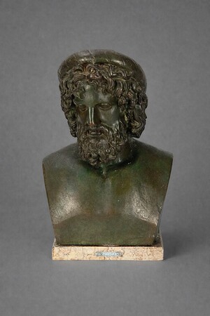 Busto que representa a Esculapio, realizada en metal patinado, con patina verdosa oscura que resalta volumenes y aspecto envejecido, rostro barbado y caballera ondulada, la pieza se apoya sobre base de marmol