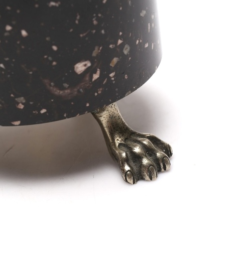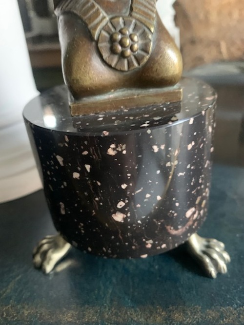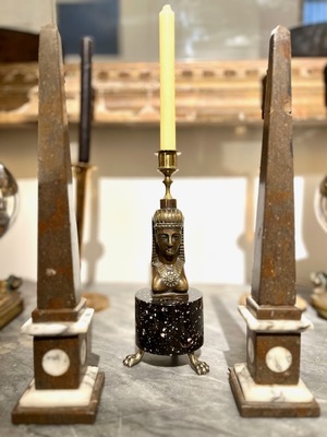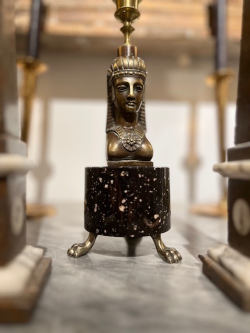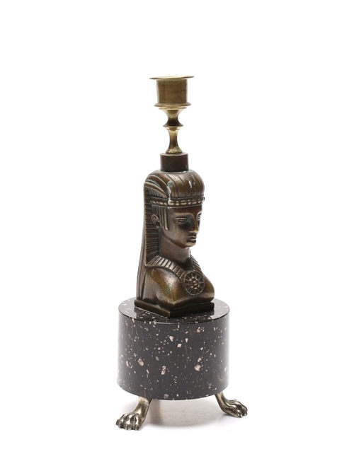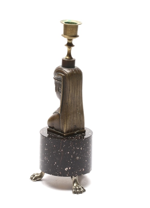 Candelerode estilo imperio con base cilindricade pórfido que descansa sobre tres garras de bronce, la base es el soporte de una figura  esfinge. Suecia s.XIX.