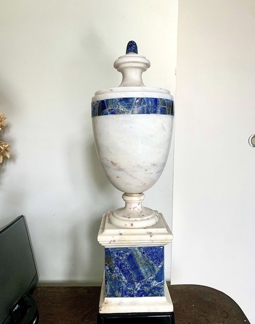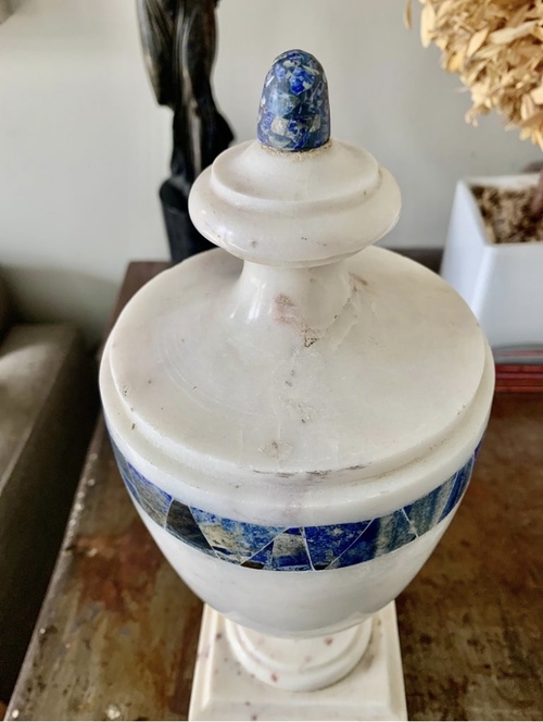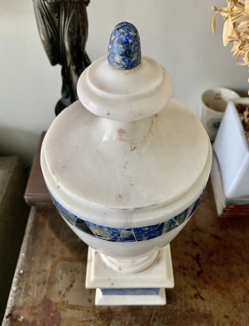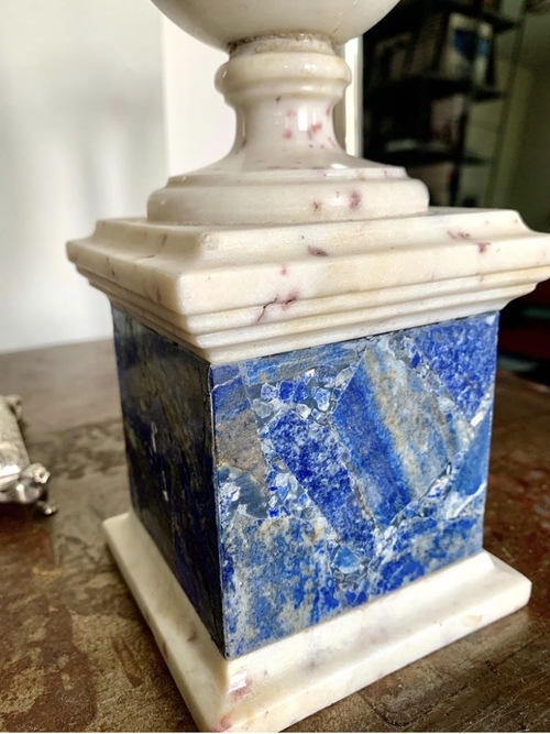Jarrón o urna Grand Tour de mármol blanco con decoracón de lapislázuli en base y un anillo rodeando parte superior.