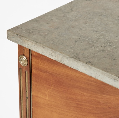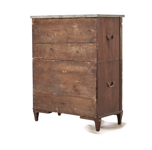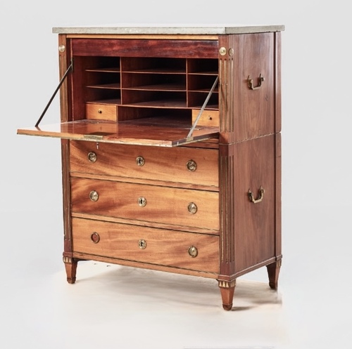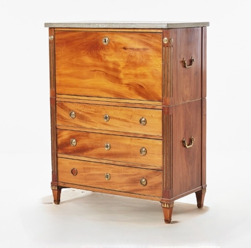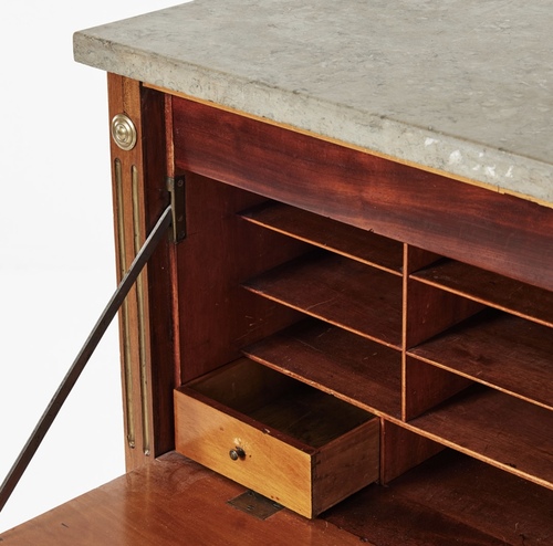 Un escritorio gustaviano tardio, Suecia siglo XIX, en madera de caoba.con tres cajones y escritorio con tapa abatible, dividido en dos cuerpos con  asas en latón laterales, y decoracion con bocallaves y tiradoes tambien en latón.Tapa en mármol gris.