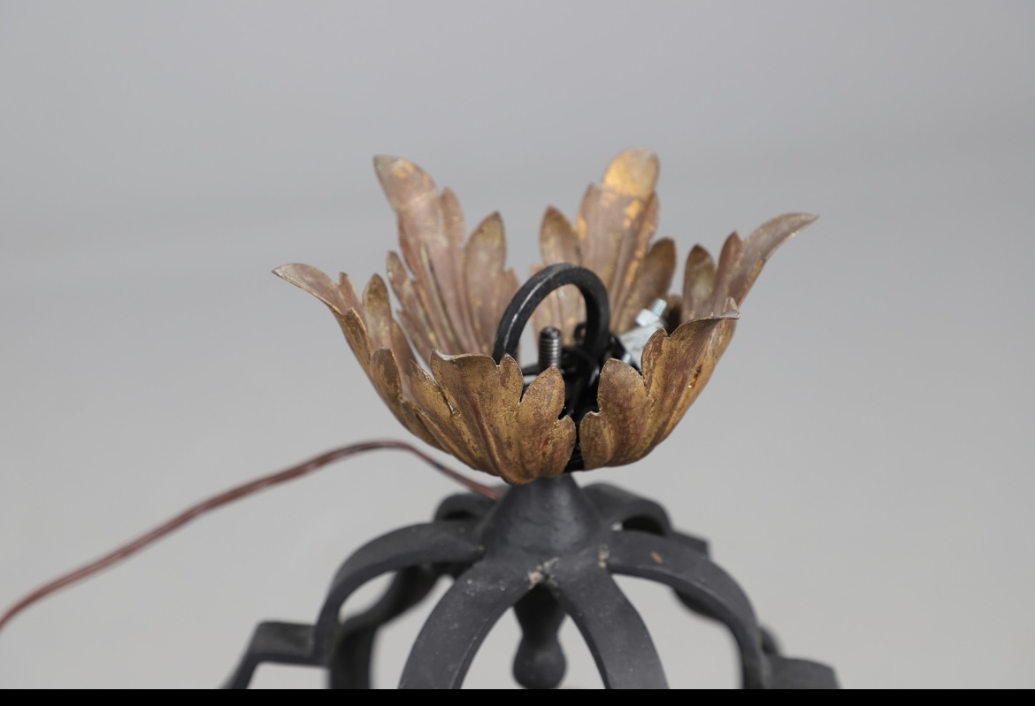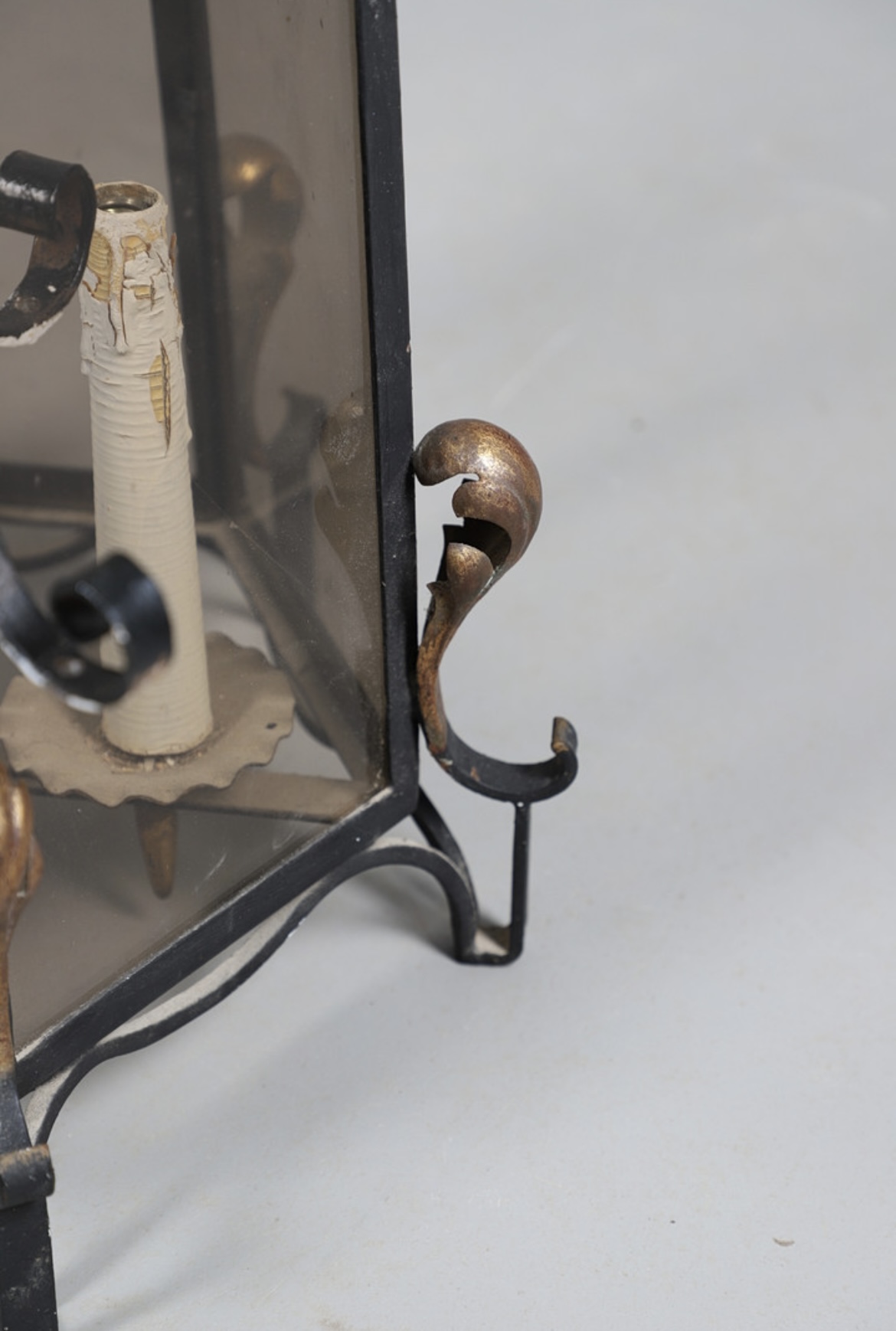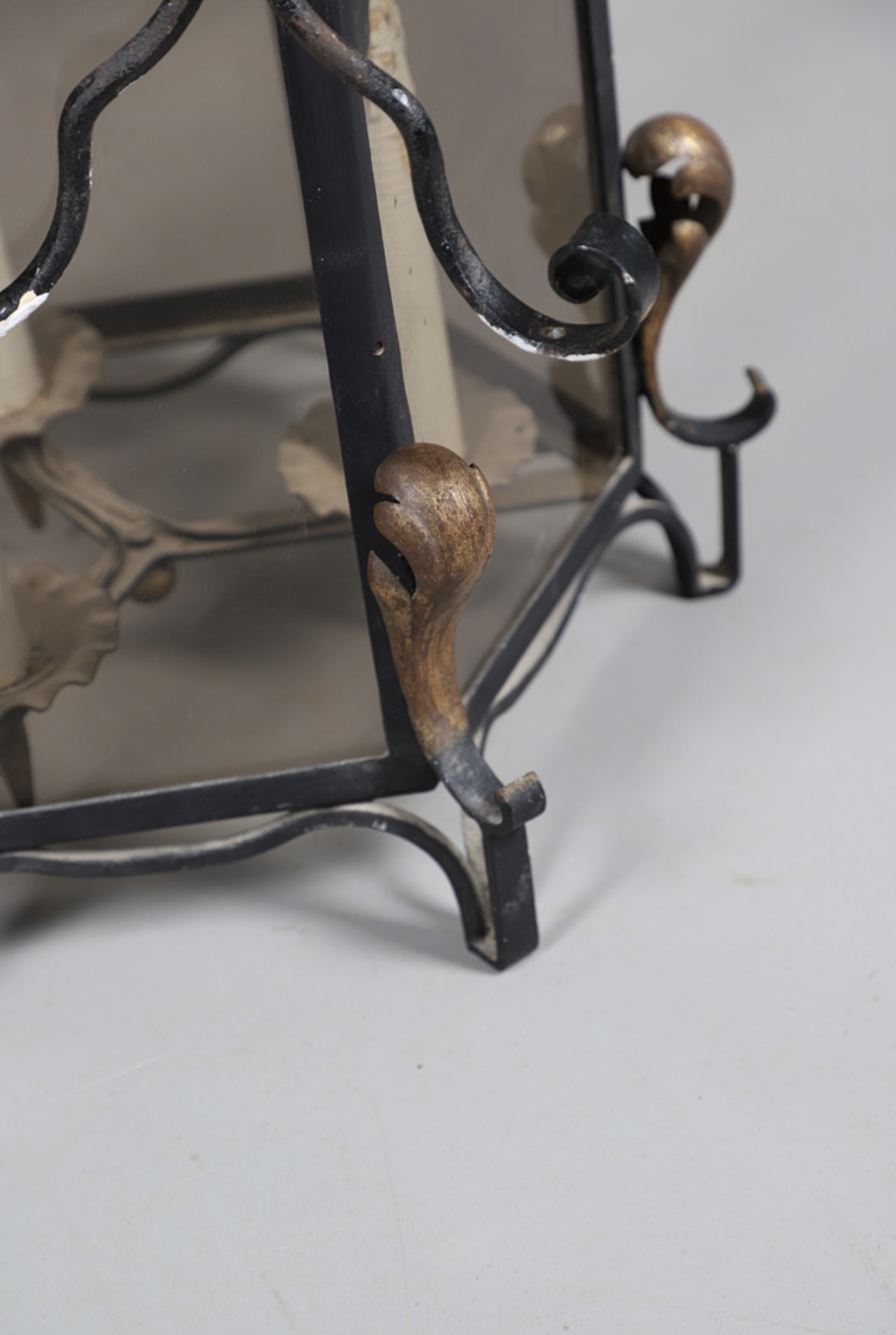 Farol de los años 40.de forma hexagonal, con seis paneles de cristal y tres puntos de luz en su interior. Con decoración pintada en dorado en el exterior y forma decorativa en la parte superior.