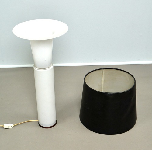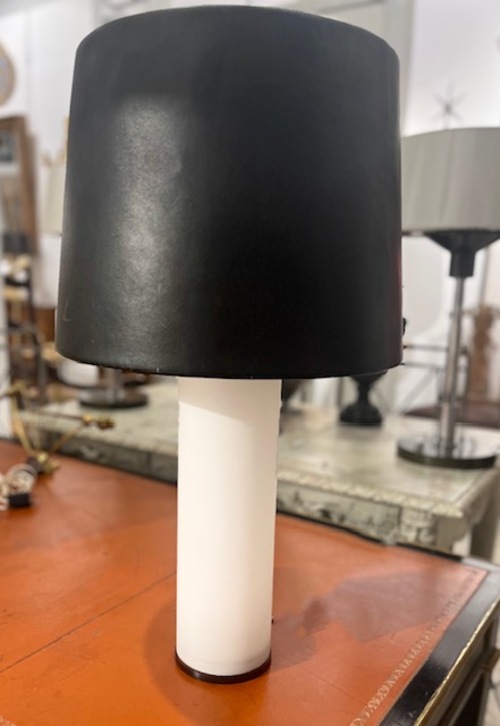 Lámpara sueca de los años 60, en cristal opalina blaquezino con pantalla negra. Diseño de la marca UNO & OSTEN.