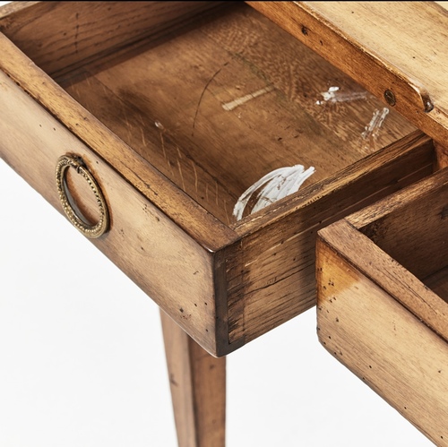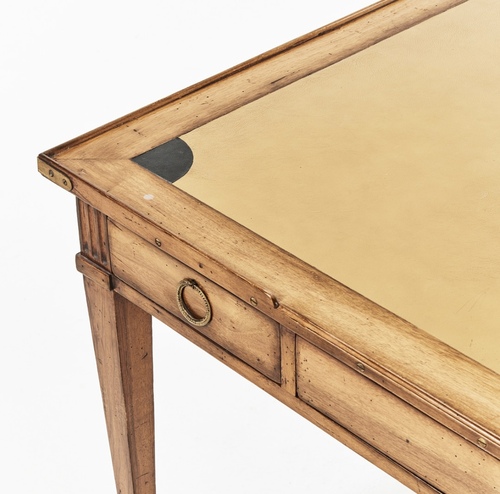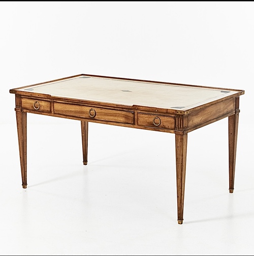 Mesa escritorio estilo Luis XVI , en madera de niogal, de lineas rectas y equilibradas, tapa rectangular enmarcada con filiteado, con patas acanaladas, terminadas en sabot, tres cajones con tiradores de bronce. Francia s.XIX,