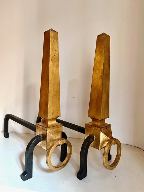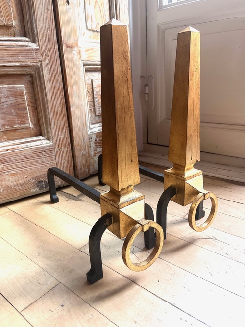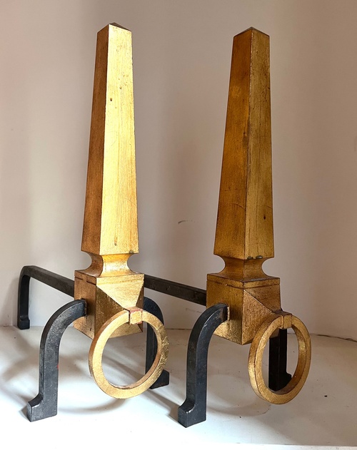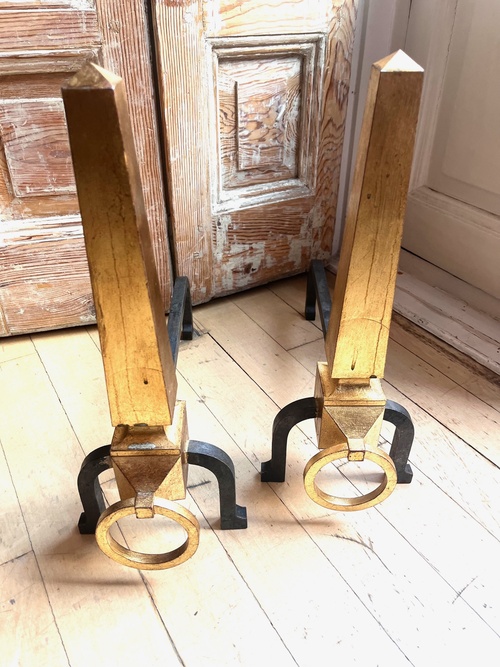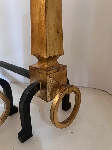 Preja de morillos antiguos realizados en hierro forjado con acabado dorado. Presentan un diseño arquitectónico de líneas sobrias y elegantes, con cuerpos verticales facetados y aros frontales decorativos, característicos de trabajos artesanales de calidad.