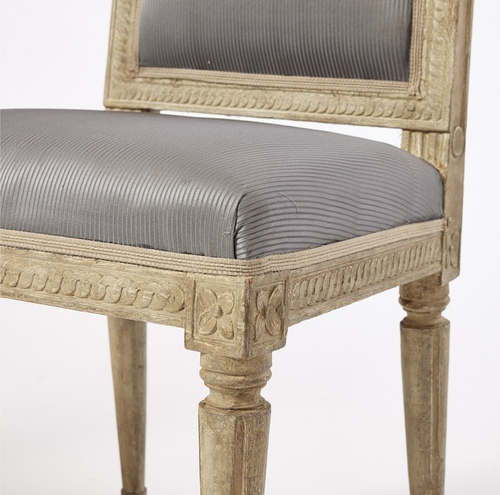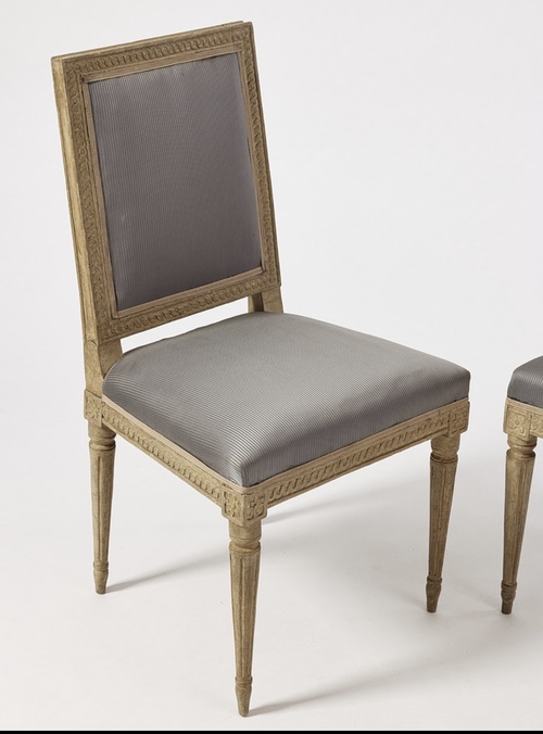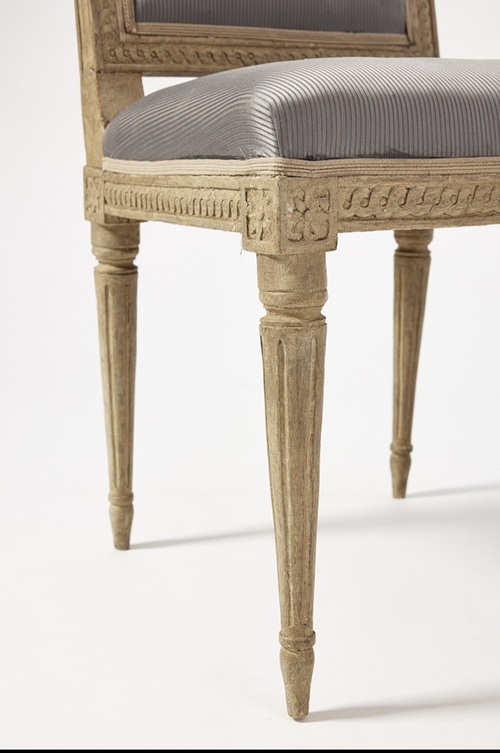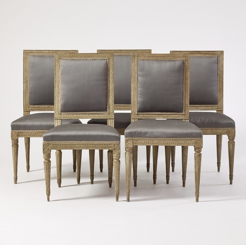 Un conjunto de seis sillas gustavianas, de la segunda mitad del siglo XVIII, firmadas por Melchor Lundberg, respaldo rectangular con cecoracion de cintas de trenzas, flores en las esquinas, patas conicas y caneladas. pintadas en gris perla,